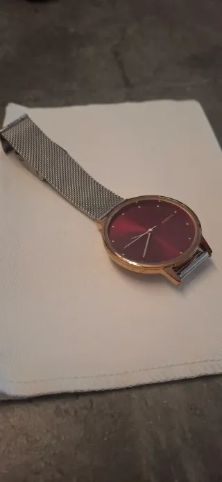 Elegante reloj de la marca PARFOIS con una esfera en tono burdeos y detalles dorados. - Diseño moderno y sofisticado. - Correa de malla dorada. - Marcadores de hora dorados.