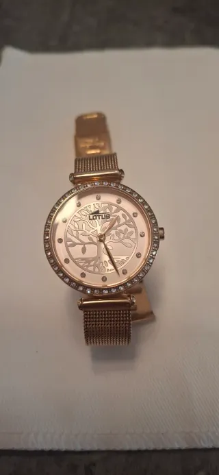 Elegante reloj de la marca Lotus con un diseño sofisticado. - Esfera con diseño de árbol de la vida. - Bisel adornado con circonitas. - Correa de malla metálica. - Color dorado y rosa.
