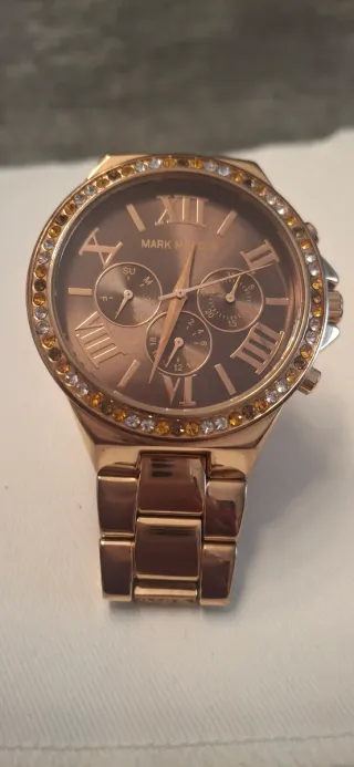Elegante reloj de la marca Mark Madix con un diseño llamativo. - Bisel adornado con pedrería. - Esfera con números romanos. - Correa de eslabones.