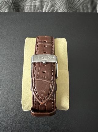 Elegante reloj Festina con correa de cuero marrón y esfera negra. - Diseño cronógrafo. - Bisel con escala taquimétrica. - Correa de cuero con acabado cocodrilo. - Ventana de fecha.