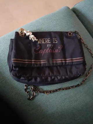 Bolso de la marca Le Pandorine. - Color azul - Diseño con frase WHERE IS my Captain? - Cadena metálica. - Adorno de figura metálica.