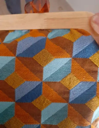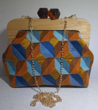 Bolso de mano artesanal con un diseño único. - Estructura de madera. - Frontal de tela con estampado geométrico. - Cadena dorada para llevar al hombro. - Cierre de broche con detalles de carey.
