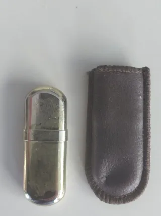 Mechero vintage de la marca Brass, modelo 3. - Cuerpo principal en tono dorado. - Tapa plateada. - Incluye funda de cuero marrón.