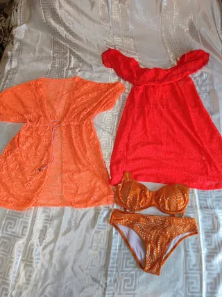 Conjunto de playa que incluye un kimono y un bikini. - Kimono de tejido ligero con cordón ajustable en la cintura. - Bikini con estampado de puntos y detalles brillantes. - Vestido de playa rosa con escote elástico. El naranja está más usado pero en buen estado lo demás no lo he usado