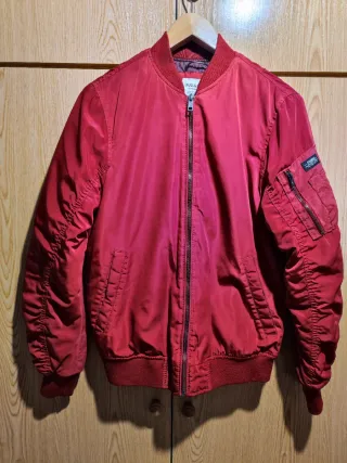 Chaqueta cazadora Bomper De la marca Pull & Bear Talla S - 36 Chaqueta en muy buen estado usado pocas veces, casi nueva. La calidad del tejido es muy buena, por ambas caras. Color rojo burdeos brillante muy bonito. Posee bolsillos laterales y uno interior. NO es reversible la chaqueta. Si tú eres un hombre súper elegante, está es tu chaqueta cazadora Bomper. No te lo pienses.