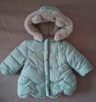 Abrigo reversible para bebé, con un diseño muy tierno y apenas usado. - Color principal verde agua con topos oscuros. - Forro interior blanco y suave. - Capucha con detalles de peluche. - Cierre frontal con botones.