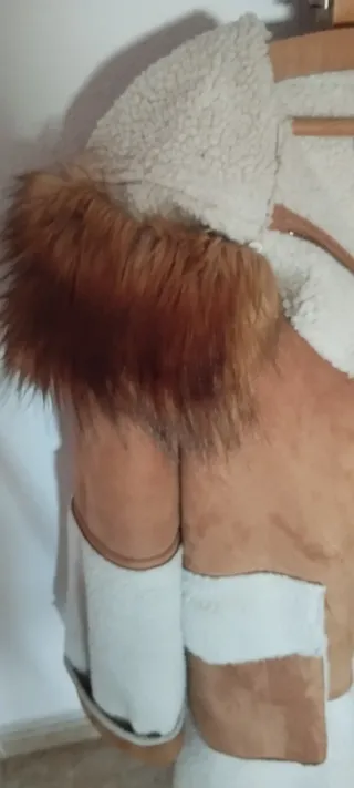 Abrigo largo de Zara con diseño patchwork. - Exterior en ante sintético color beige. - Forro interior de borreguito blanco. - Detalle de pelo sintético en capucha. - Bolsillos frontales.
