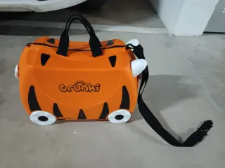 Maleta infantil con diseño divertido. - Color naranja con detalles negros. - Ruedas para facilitar el transporte. - Asa para llevarla o para que un adulto la arrastre. Se ha usado 4 veces como mucho