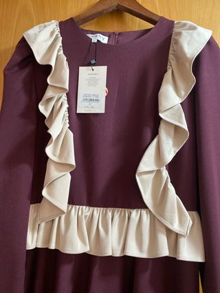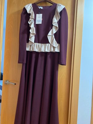 Vestido de la marca Coosy con un diseño elegante y detalles de volantes. - Color principal morado con detalles en beige. - Volantes decorativos en los hombros y en la parte inferior. - Manga larga.