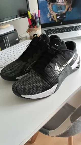 Zapatillas deportivas Nike Metcon en color negro y blanco. Diseño moderno y cómodo. Muy utilizadas en CrossFit y alterofilia por su base plana. Utilizadas una sola vez. - Parte superior de malla transpirable. - Suela de goma para mayor tracción. - Cierre de cordones.