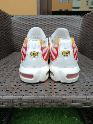 Zapatillas Nike Air Max Plus TN. - Diseño con detalles en rojo y naranja sobre base blanca. - Unidad Air visible en la mediasuela.