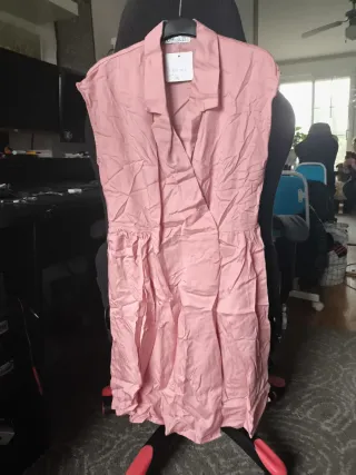 Vestido camisero sin mangas, con un diseño cruzado y falda con vuelo. Es una prenda sin estrenar, de la marca española MdM. Muy arrugado, pero tiene fácil solución. 100% lyocell. Precio original, 45 e. - Cuello tipo solapa. - Cierre cruzado.