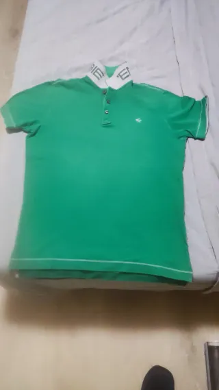Camiseta de manga corta de la marca Energie en color verde. Presenta un diseño clásico con cuello tipo polo y botones. - Cuello con detalle de letras. - Pequeño logo bordado en el pecho. - Costuras blancas decorativas en el bajo y las mangas.