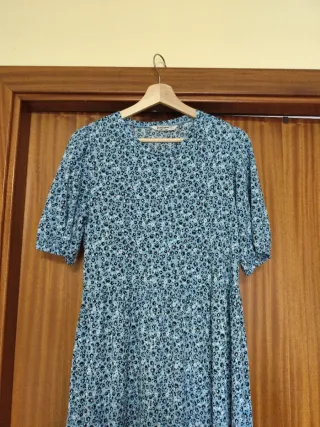 Vestido de corte midi con estampado floral y manga corta. - Diseño con volantes en la falda. - Escote redondo - Cintura elástica.