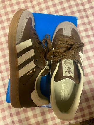 Zapatillas Adidas Samba en tonos marrones y beige. Un clásico atemporal. - Diseño icónico con las tres rayas. - Detalle de gamuza en la puntera y talón. - Suela de goma. - Logo de Adidas en la lengüeta y plantilla.