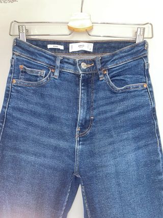 Vaqueros pitillo de tiro alto (cintura alta) de Mango, modelo Soho, talla 34 pero sirve 36. Azul oscuro estilo lavado, muy bonito, estiliza mucho. Lo vendo porque me queda grande, poco usado. - Elástico - Diseño clásico de cinco bolsillos. - Cierre con cremallera y botón.