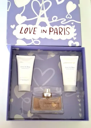 Set de regalo Love in Paris de Nina Ricci. - Incluye un frasco de perfume de 50ml. - Contiene dos lociones corporales. - Presentado en una caja decorada con temática de París.