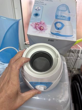 Vaporizador facial silver crest con mascarilla ergonómica y adaptador nasal. - Capacidad de 60ml. - Incluye accesorios. - Diseño moderno en blanco y azul.