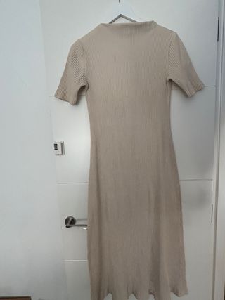 Vestido largo de punto en color crema. Su diseño de canalé le da un toque moderno y elegante. - Manga corta. - Cuello alto. - Largo midi.