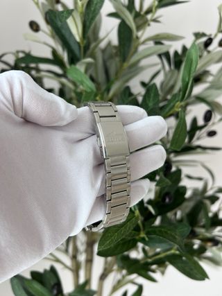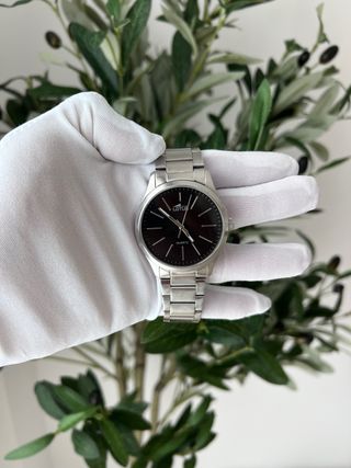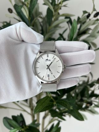 Elegante reloj Lotus con un diseño moderno y sofisticado. Funciona perfectamente. Pequeño arañazo en el cristal que no se aprecia a simple vista (arriba derecha) - Funda de reloj de regalo - Esfera blanca con detalles plateados. - Correa de malla plateada. - Indicador de fecha. - Pila nueva - 44 milimetros