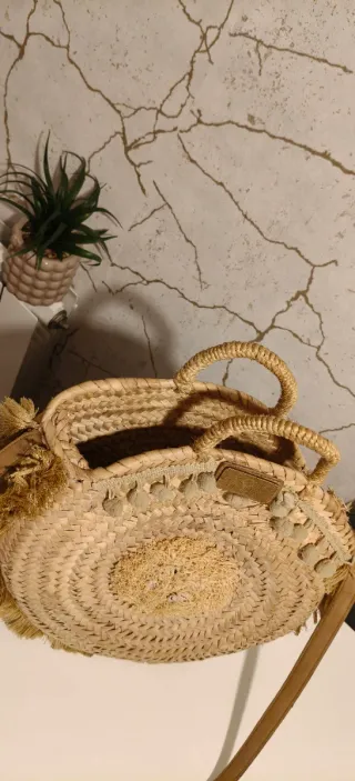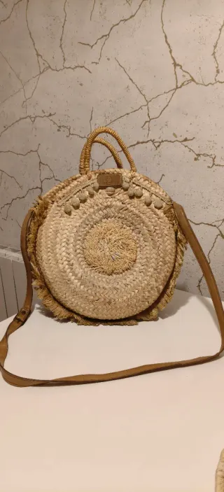 Bolso de esparto con un diseño redondo y detalles de flecos y pompones. - Material: Esparto - Color: Beige y marrón - Adornos: Flecos y pompones decorativos - Correa: Correa de cuero ajustable