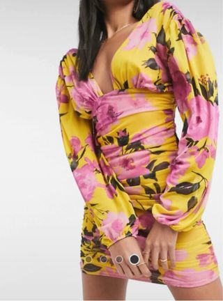 Vestido de ASOS DESIGN con un estampado floral vibrante. - Diseño con escote pronunciado. - Mangas largas abullonadas. - Detalle de fruncido en la parte delantera. - Falda drapeada.