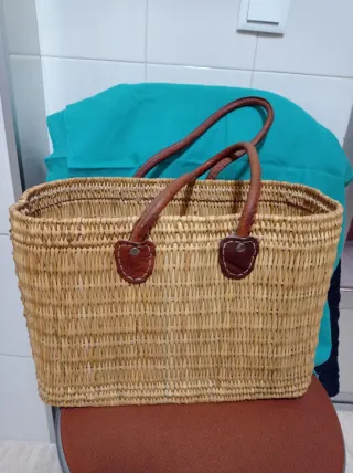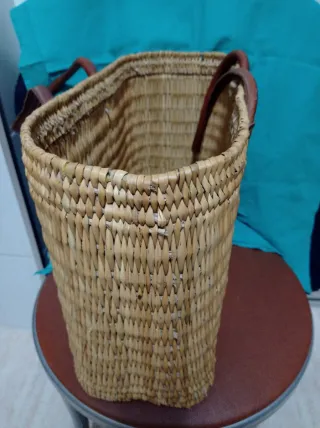 Cesto o bolso de mimbre, perfecto para playa o como elemento decorativo. - Material: Mimbre. - Asas de cuero marrón. - Diseño tejido a mano.