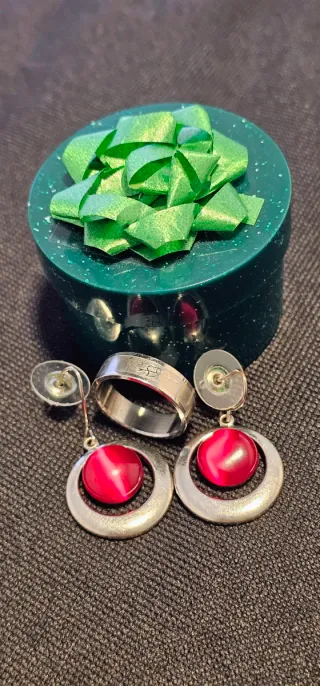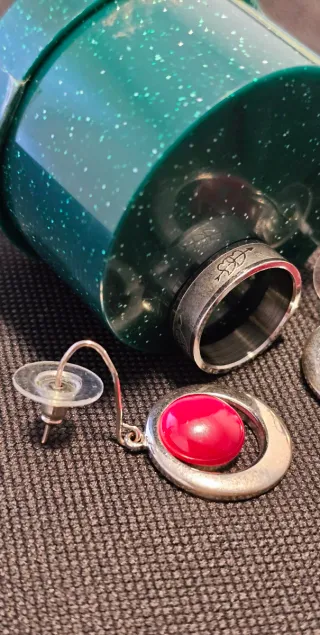Anillo y pendientes aro con piedra roja de Acero