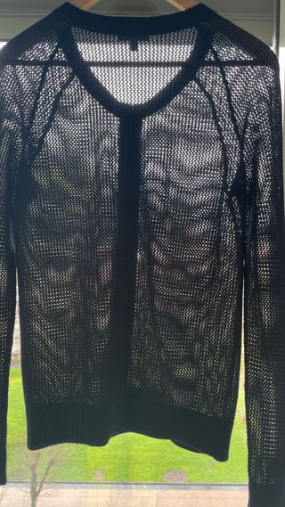 Blusa de punto con un diseño calado y detalles de trenzas. Tiene manga corta y un cordón ajustable en la cintura para ceñir la prenda. - Tejido calado con motivos de trenzas. - Cintura ajustable con cordón. - Diseño de manga corta. Buen estado y listo para usar. ¡Acepto ofertas!
