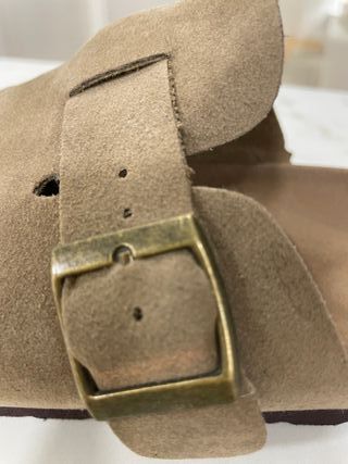 - Zuecos acabado en ante color topo, con hebillas color cobre. - Plantilla de corcho en el lateral y ante en el interior. - Suela de goma acanalada. - Talla 40 en perfecto estado. - Sin nombre. - Los recibí ayer mismo desde otra plataforma como "nuevo sin etiqueta". Los vendo porque me quedan un pelín justos a lo largo.