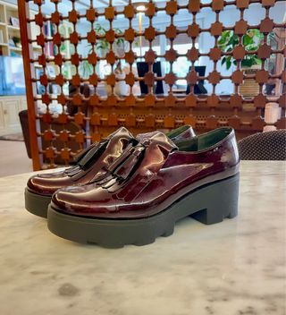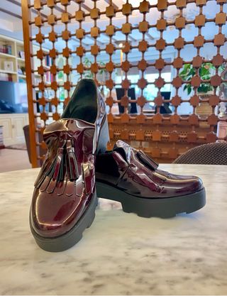 Mocasines de charol con un diseño elegante y moderno. Están completamente nuevos, nunca se han usado. Costaron 110€. - Acabado brillante. - Detalle de flecos en la pala. - Suela gruesa y robusta.