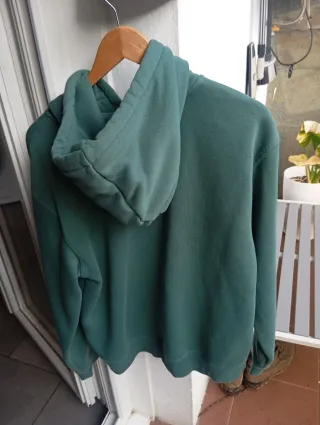 Sudadera cómoda y versátil con capucha. - Tejido suave y agradable al tacto. - Bolsillos delanteros. - Cordones ajustables en la capucha. - Poco usada. - Se le ha quedado pequeña a mi hijo