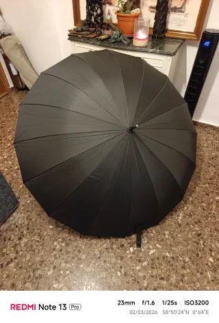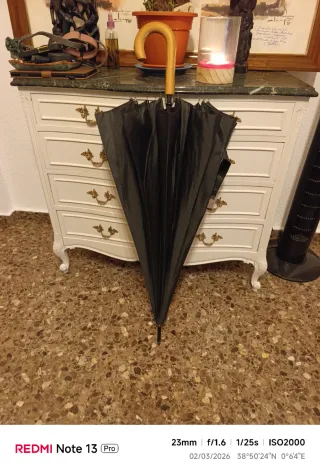 Paraguas de color negro, diseñado para resistir el viento. - Mango curvo de madera. - Tela resistente. Largo cerrado 105 cm Abierto 132 cm