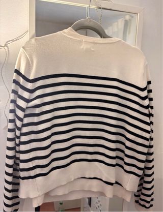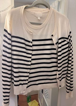 Conjunto de chaqueta y suéter con diseño de rayas. - Chaqueta de punto con botones. - Suéter de manga corta - Cuello redondo. El sueter pone T.S y la chaqueta M, pero equivale a una M cumplida