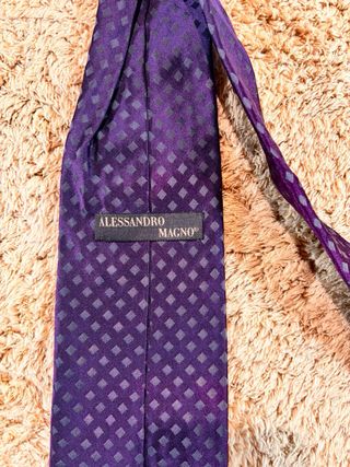 Elegante corbata de seda con un diseño geométrico de rombos en tonos púrpuras y grises. Perfecta para añadir un toque de distinción a cualquier atuendo. - Tejido: 100% Seda. - Diseño: Rombos geométricos.
