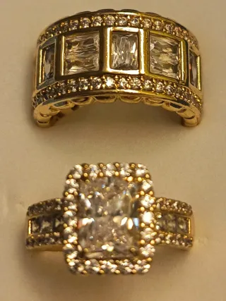 Elegante conjunto de dos anillos laminados en oro de 14 quilates. Presentan un diseño diamantado con incrustaciones de piedras blancas. - Anillo superior con diseño de rectángulos y detalles. - Anillo inferior con gran piedra central y halo de piedras. - Acabado brillante.