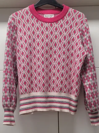 Jersey de punto para mujer con un diseño de rombos en tonos rosas y grises. Cuello redondo y puños - Diseño de rombos. - Cuello redondo. - Puños y bajo a rayas.
