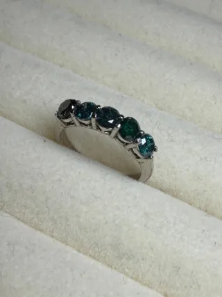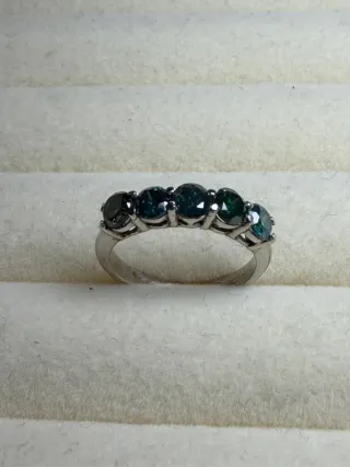 Elegante anillo de oro 14k con diamantes azules. - Peso total de diamantes: 1.67 quilates. - Diseño con cinco gemas centrales. - Montura de oro blanco.