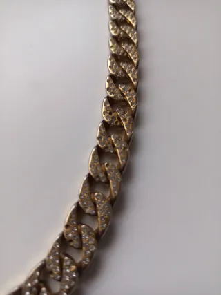 Elegante cadena de eslabones en tono dorado. El cierre está adornado con pequeñas incrustaciones brillantes. - Diseño de eslabones cubanos. - Cierre de caja con incrustaciones.