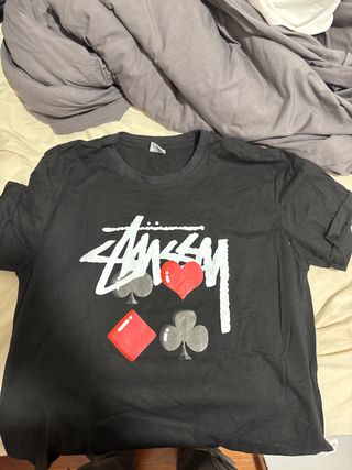 Camiseta Stussy de color negro con un diseño llamativo de naipes. - Estampado frontal con el logo de Stussy. - Motivos de corazón, diamante y trébol.