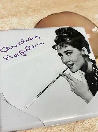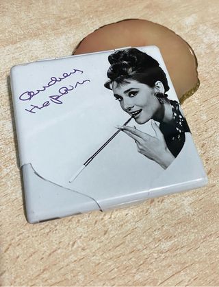 Pitillera con imagen de Audrey Hepburn y su firma. - Diseño con fotografía icónica de Audrey Hepburn. - Firma morada de Audrey Hepburn. - Color blanco predominante. Pitillera/Estuche/Cajita de Audrey Hepburn - Estilo "Breakfast at Tiffany's" Encantador estuche/cajita/pitillers con la icónica imagen en blanco y negro de Audrey Hepburn de su famosa película Desayuno con Diamantes. #BreakfastatTiffanys Es de metal, ideal para guardar pequeños objetos. El estuche ha sido usado, y la tapa tiene unos pequeños desperfectos (como se muestran en las fotos de detalle), aun así cierra correctamente. Medidas:
