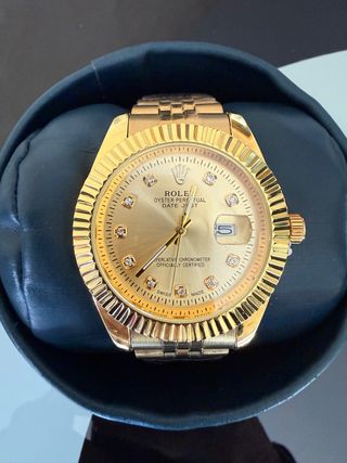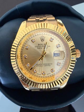Elegante reloj de pulsera con un acabado dorado brillante y detalles de diamantes. - Bisel estriado. - Esfera con marcadores de diamantes. - Ventana de fecha. - Correa de eslabones dorada.Movimiento mecánico.Gente solo interesada.No contesto ofertas