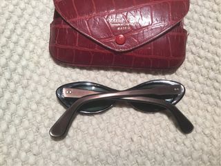 Auténticas gafas de sol CAT EYE de los años 60, con estrellas imitando diamantes en las patillas y en la montura. Están en perfecto estado. Las lentes, de color verde, están impecables. Si te gustan las gafas vintage sin duda son tus gafas. - Lentes verdes. - Incluye estuche original de cuero rojo con relieve. - Cierre a presión en el estuche.