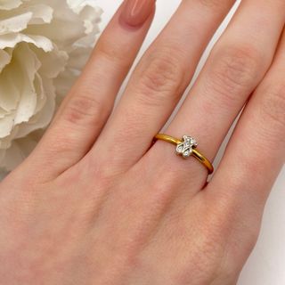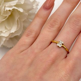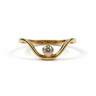 RE1782 Delicado y elegante anillo realizado en oro amarillo de 18 quilates, con un diseño moderno y minimalista de líneas curvas que envuelven sutilmente el dedo. En el centro destaca un diamante natural de 0,03 quilates, TALLA: 12 PESO: 1.35gr Incluye certificado de calidad emitido por joyeria, donde se detallan los materiales y caracteristicas de la pieza.