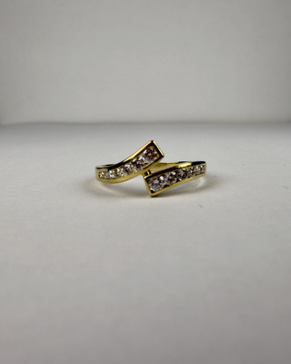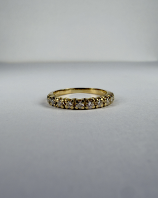 RE1781 Elegante anillo de oro amarillo de 18 quilates con 10 diamantes naturales de 0.04ct engastados en línea que aportan un brillo muy fino y sofisticado. Su diseño tipo media alianza lo hace perfecto tanto para llevar solo como para combinar con otros anillos. TALLA: 9.5 PESO: 1.90g Incluye certificado de calidad emitido por joyeria, donde se detallan los materiales y caracteristicas de la pieza.