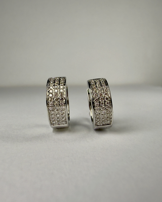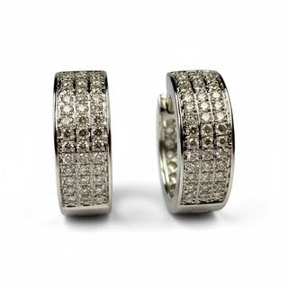 RE1788 Elegantes pendientes tipo aro elaborados en oro blanco de 18 quilates, engastados con diamantes naturales con un peso total aproximado de 0.50 quilates. Diseño moderno con varias filas de diamantes que aportan un brillo espectacular. PESO: 4.12g MEDIDAS: DIAMETRO: 1.3 cm ANCHO: 0.5cm Incluye certificado de calidad emitido por joyeria, donde se detallan los materiales y caracteristicas de la pieza.