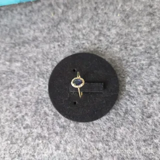 Elegante sortija con un zafiro central y diamantes alrededor. - Montura de oro de 9 quilates. - Diseño ovalado con zafiro azul. - Detalles de pequeños diamantes. Costo 400€ Vendo por falta de uso Talla 13