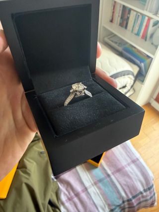 Vendo anillo de compromiso con diamante de 1.5 quilates en oro blanco de 18k de 77 Diamonds London. Diamante lab grown certificado por IGI. Características del diamante: • 1.50 ct • Color J • Claridad VS1 • Corte Ideal Incluye certificado IGI, documentos y caja original. Valoración para seguro: £4,080. Talla del anillo: S (≈19.4 mm diámetro interior). El anillo fue ajustado ligeramente más pequeño después de la compra. Está en muy buen estado. Se puede ver sin compromiso.