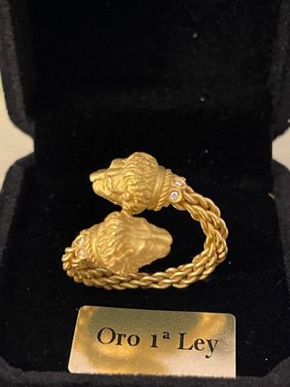 Anillo en oro amarillo de 18 quilates, con diseño de brazo abierto tipo cordoncillo, elaborado con meticulosa atención al detalle. La pieza culmina en dos cabezas de león magistralmente esculpidas, cada una engastada con una piedra lapidada que aporta intensidad y carácter a la composición. La base de cada cabeza está delicadamente ornamentada con tres diamantes talla brillante, totalizando seis diamantes, que aportan destellos de luz y refinamiento al conjunto. Medida Tatum 11-12. Para consultas o información adicional, contactar vía WhatsApp al 655 412 037.