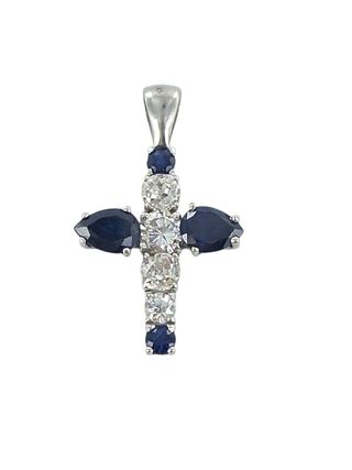 Elegante cruz de oro blanco 18k con zafiros azules y diamantes. Exclusiva Cruz de oro blanco con diamantes un total de 0.60cts de brillantes y 4 zafiros en sus puntas. - Elaborada en oro blanco 18k - Zafiros azules y diamantes engastados. - Diseño clásico de cruz.